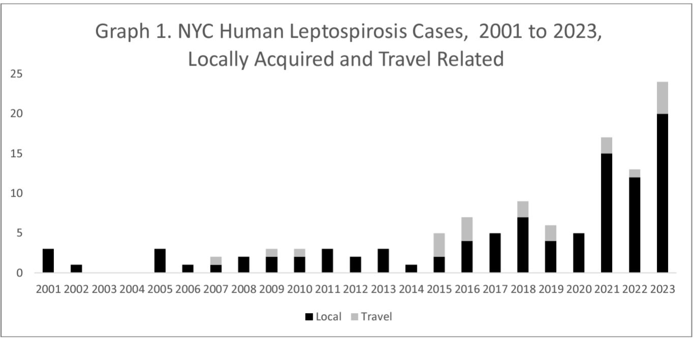 Cases of human leptospirosis remain limited — there have been six cases reported to date in the city this year — but are trending upward. Twenty-four cases were reported to New York City in 2023, the highest annual total yet, officials say.