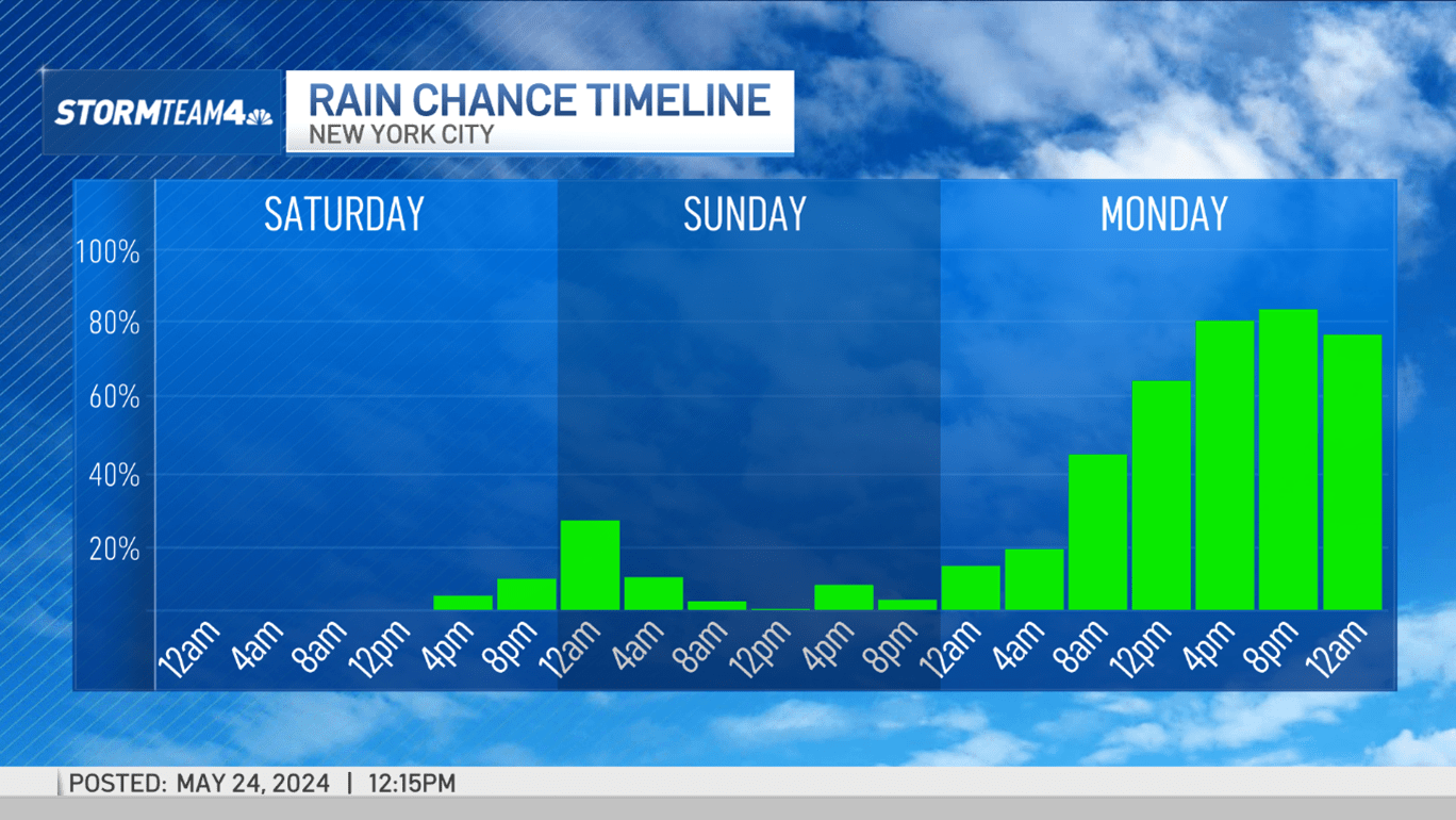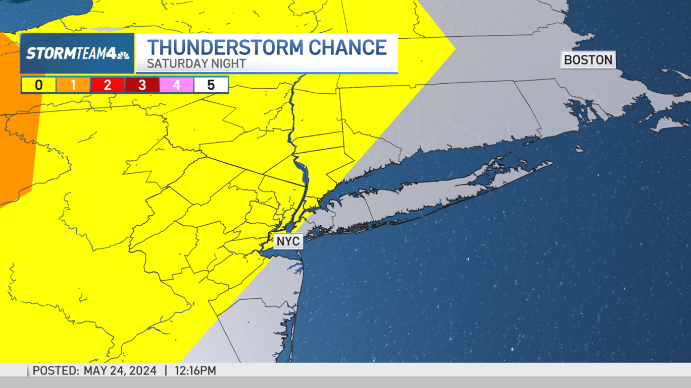 Your outdoor plans for Saturday and Sunday should be problem-free. Any shower chances will be meager and will hold off until late Saturday evening and into the overnight. Don’t be surprised if you hear a rumble of thunder, especially if you live in the Hudson Valley or North Jersey.
