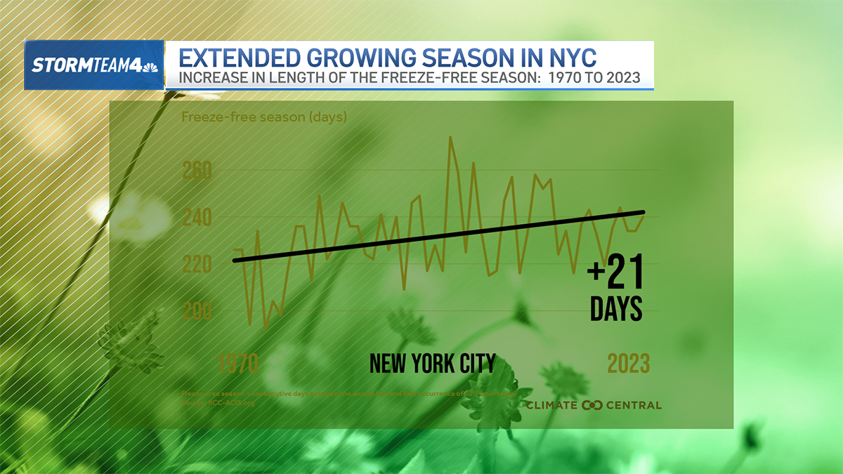 Based on data collected by Climate Central, in New York City it is averaging 21 days longer now than it was in 1970. Plants are sprouting earlier and producing pollen longer.