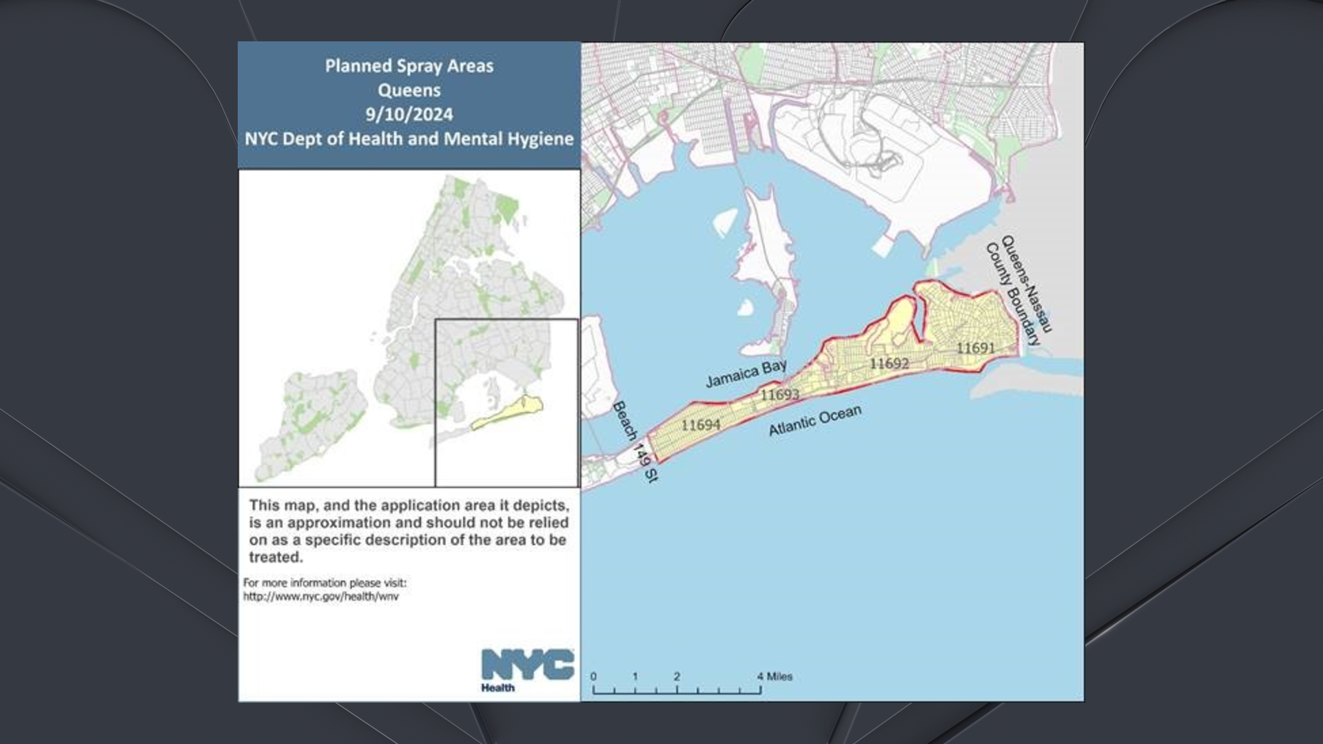 Starting during the evening of Sept. 10, city trucks will spray pesticides in sections of Queens. Spraying will start around 8:30 p.m. and last until 6 a.m. the following morning. If it rains that night, the spraying will be done the following night, on Sept. 11.
