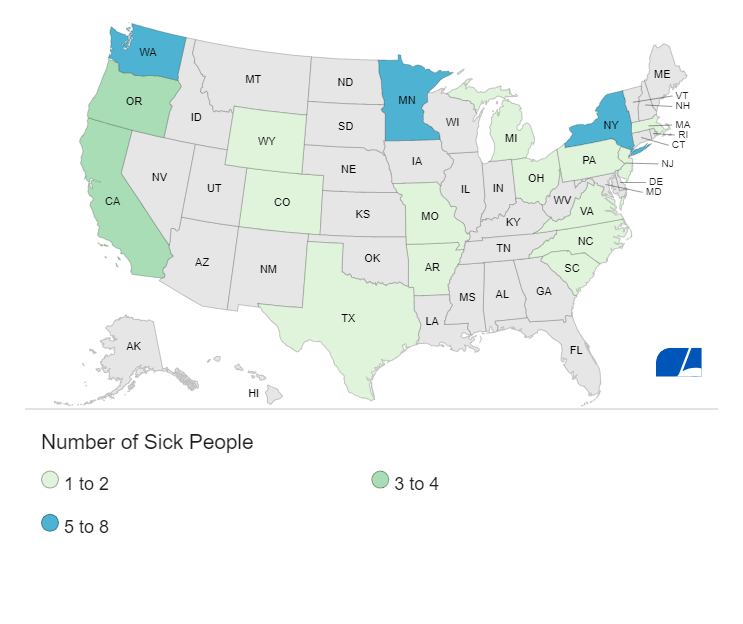 Most of the infected people live in New York, Minnesota and Washington, followed by California and Oregon, although infections have been reported in states throughout the country, according to the CDC. The person who died lived in California.