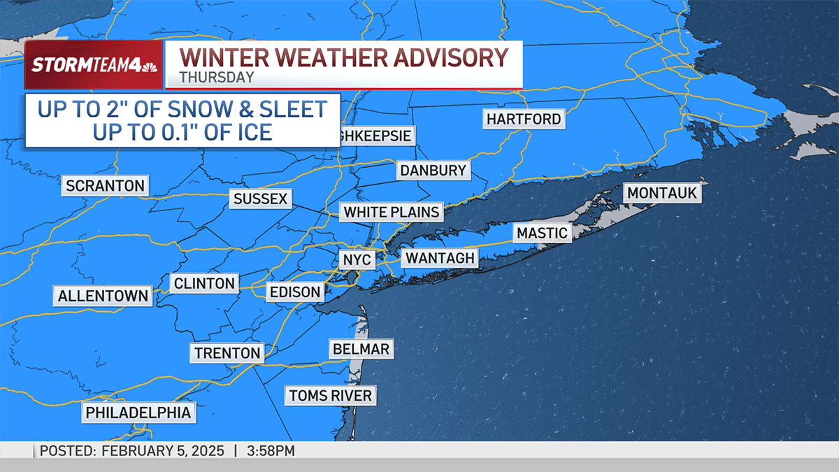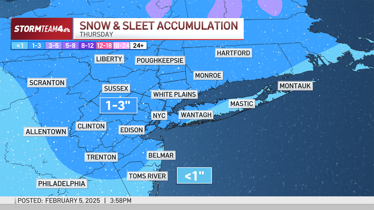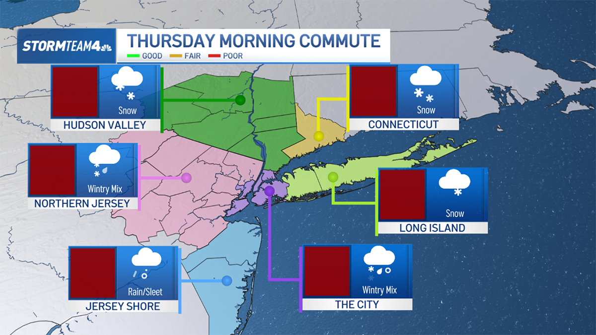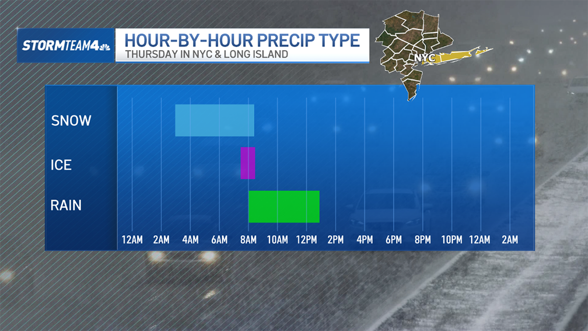 The system arrives in the New York City metro area in the pre-dawn hours Thursday. At the onset, precipitation will be entirely snow. It won’t be heavy snow, but it is still enough to reduce visibility and make for some slippery conditions for people hitting the roads. Take it easy and give yourself plenty of time to get to your destination, especially if you’re travelling on untreated roads.