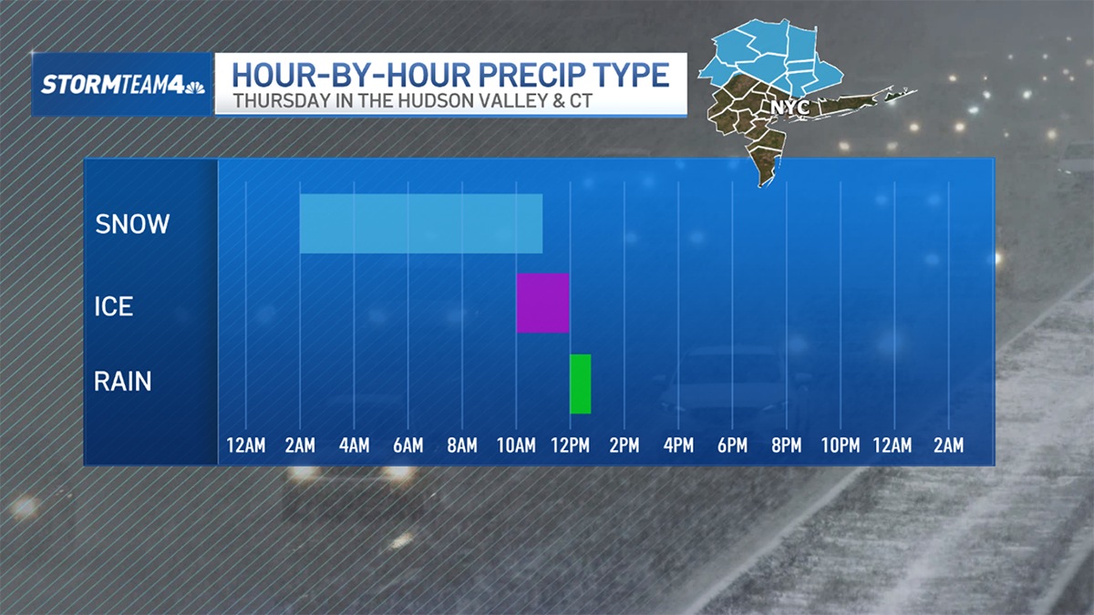 The Hudson Valley will see majority snow through Thursday morning. Brief pockets of sleet and freezing rain are possible as the system begins to exit by late morning, but there will be little to no changeover to rain.