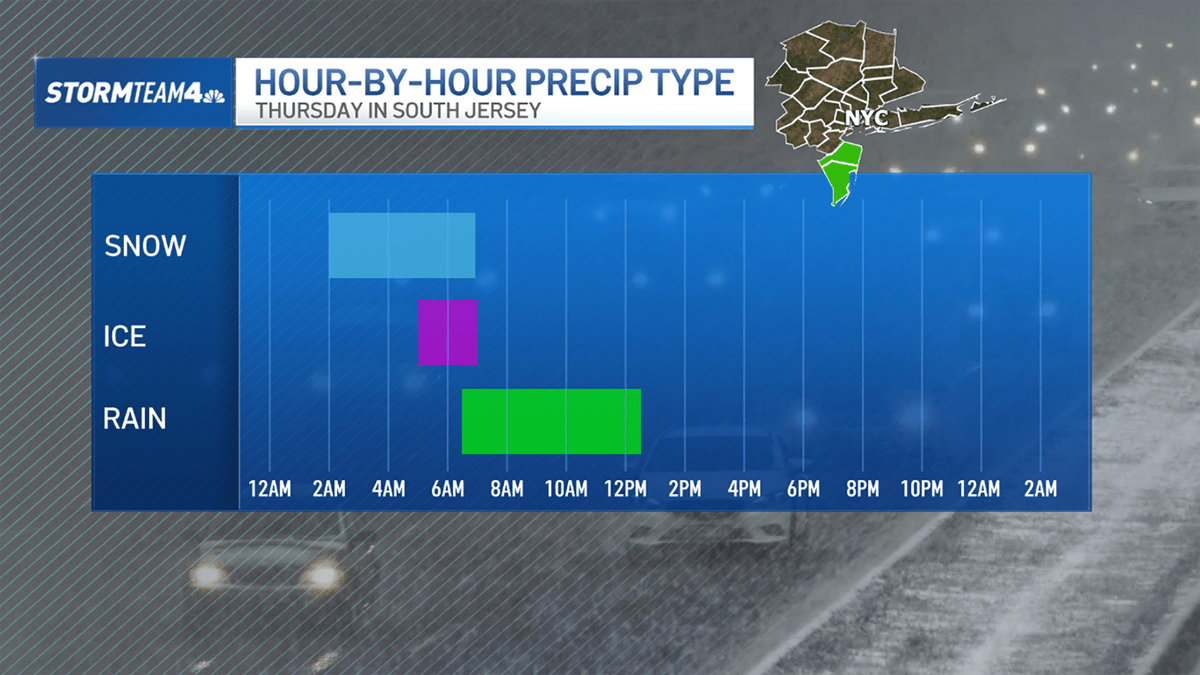 For South Jersey, a brief period of sleet and freezing rain mixes in with the snow before switching to all rain by sunrise. If you are out on the roads early, you’ll primarily have the thin dusting of snow to contend with. But if your commute puts you on the roads closer to rush hour, the relatively warmer temperatures in conjunction with the rain will result in a good amount of slush on the roads.