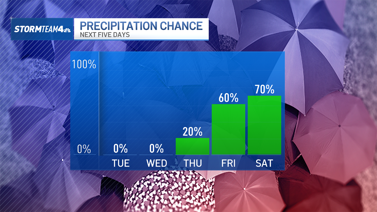 After a dry mid-week stretch, showers could return as early as Thursday and rain chances will ramp up through the first half of the weekend. The wet weather comes with a meager warm-up, but it’s nothing to write home about. We won’t crack into the 60s until after the weekend.