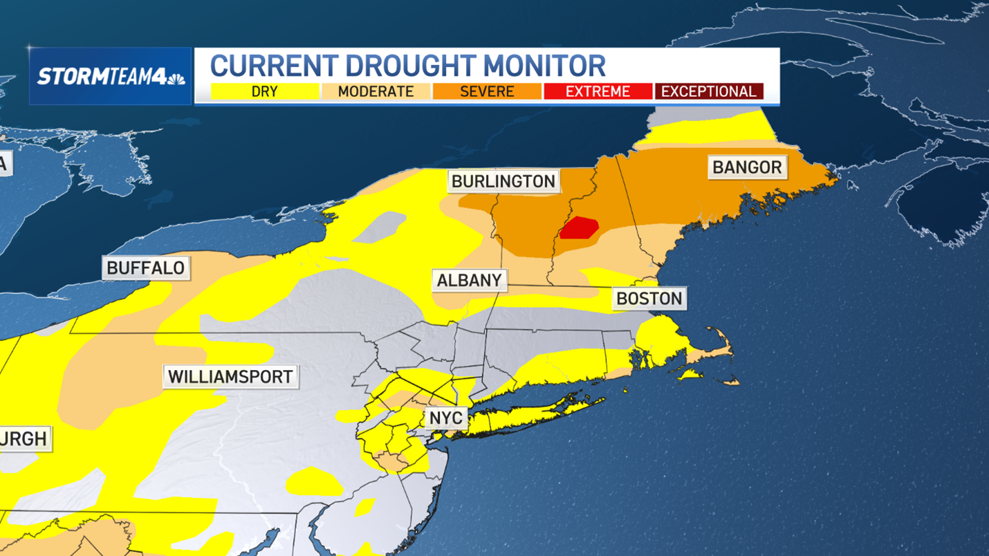 Northern New England is in much worse shape. Severe drought conditions extend from far Northeastern New York through Vermont, New Hampshire and much of Central Maine. A small section of New Hampshire is even under extreme drought conditions.
