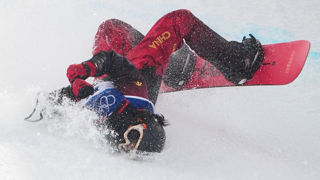 The board slammed flat onto the transition part of the pipe, but quickly caught an edge as it approached the flat part, slamming Liu violently forward while her legs and board snapped over her back — a wreck known in snowboarding parlance as a “Scorpion.”