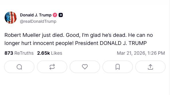 Trump posted on social media about Mueller’s death: “Robert Mueller just died. Good, I’m glad he’s dead.” The Republican president added, “He can no longer hurt innocent people!”